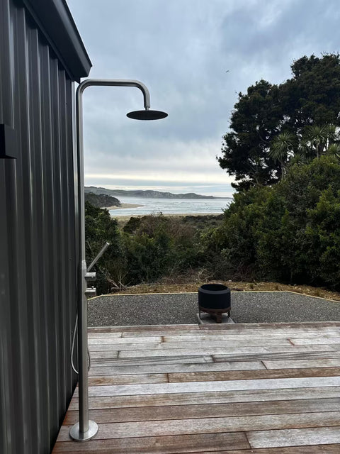 Upon arrival, wind around the pebbled path, passing a wood-fired hot tub, while a majestic cabbage tree stands as the centrepiece.