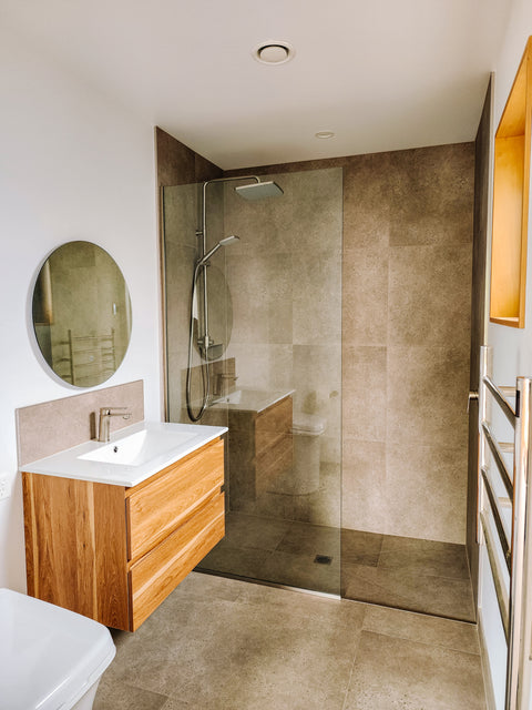 Greens Volt series tapware features throughout, including a slider shower with rainfall head.