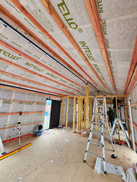 For our Pohutukawa model we use Laminated Veneer Lumber (LVL) for our primary 140mm structure, this area is insulated with Earthwool Ecose insulation and sealed with Pro Clima Intello vapor barrier.